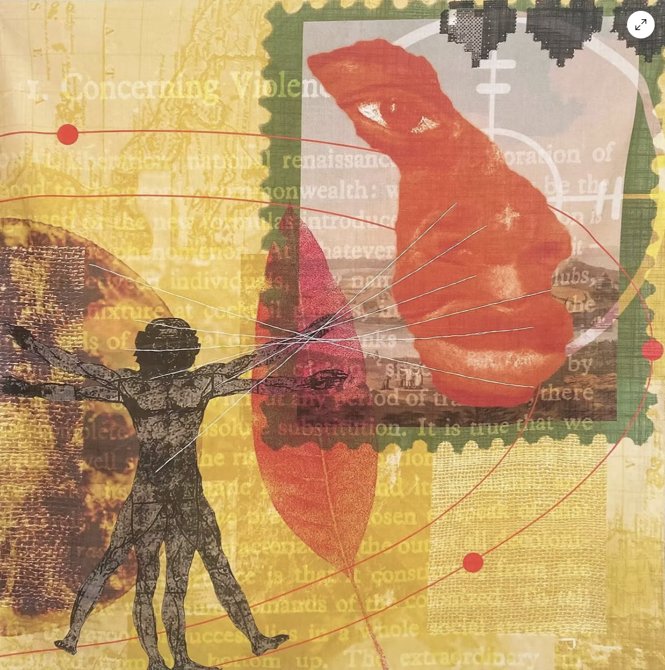 Hannah’s artworks are ones of interwoven stories and experiences. Drawing on the world around her for inspiration, through conversations or Substack articles or simply the fabric she finds on her day to day adventures, Hannah creates from a perspective of observation. Digging deeper, this perspective is prevalent in her literary interests too. Political theory is a foundational area of inspiration for Hannah and is visible across her artistic practice. When curating and creating for her most recent solo exhibition, We Will Not Come In Peace, the influences of both Fanon’s Wretched of the Earth and Freire’s Pedagogy of the Oppressed were integral. Using both works as inspiration led Hannah to create Afrosurrealist narratives about systemic marginalisation and the afterlives of Western colonialism and imperialism. As a Caribbean woman in the UK herself, Hannah explored systems of dehumanisation within healthcare and educational spaces by drawing on the personal testimonies of people in these groups. By interweaving elements of the personal and public, Hannah’s artwork consists of layers of rich inspiration.